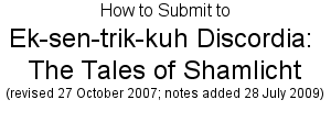 | Submission Guidelines: How to Submit to Ek-sen-trik-kuh Discordia: The Tales of Shamlicht (see How to Submit to Xtra Stuff for how to submit stuff, and Stuff We Need Now for stuff we need now. Clever headings, what?) |